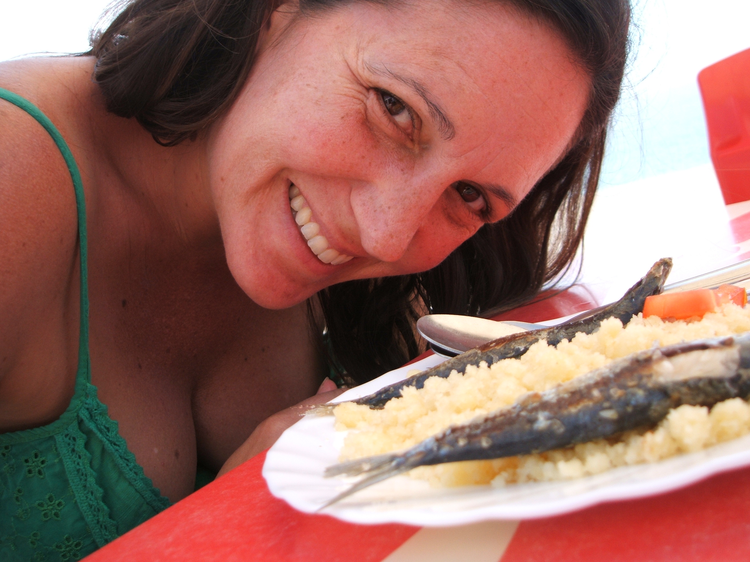 During the summer months the “chiringuitos” set up an open fire to grill the fresh sardines. We call them “sardinas al espeto”, sardines on a skewer. For most of my life I thought I hated sardines (?). Little did I know about the delicate flavor of these healthy fish. I prefer the smaller sardines to the larger ones. The larger ones tend to be oilier and have a stronger flavor. A favorite tapa here is “migas” or sauteed breadcrumbs and garlic, topped with grilled sardines. Sometimes a bit of melon is thrown in. Delicious!