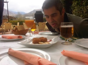 Sundays invite adventure and escaping from the city center. Even though we all laugh and criticize the “domingueros” or “Sunday drivers”, we end up being one many times during the year. So, today we went up just a bit into the mountains to breathe some fresh air and see what the day would bring. Basically it is hard to go wrong around here on a weekend. As long as you have good company and some open space for the kids to play, the day is pretty much set. Lucky for me I have friends who also have a damn good sense of humor which makes the day just that much brighter. Even with the clouds. We ordered some food to share and then just as I was mourning the lack of homemade croquetas on the menu, this tapa appeared on the table. It was as if they had read my mind. My friend Annette and I both have a bit of an obsession with ordering homemade croquetas when available. I think we are trying to find the best. There is a lot to know about the “croqueta” in Spain. Croquetas can be real crap sometimes. Frozen and produced by a machine. Or just plain bland, boring, and disgusting. But, when you find a good croqueta, it is like a delicious bit of fried love.