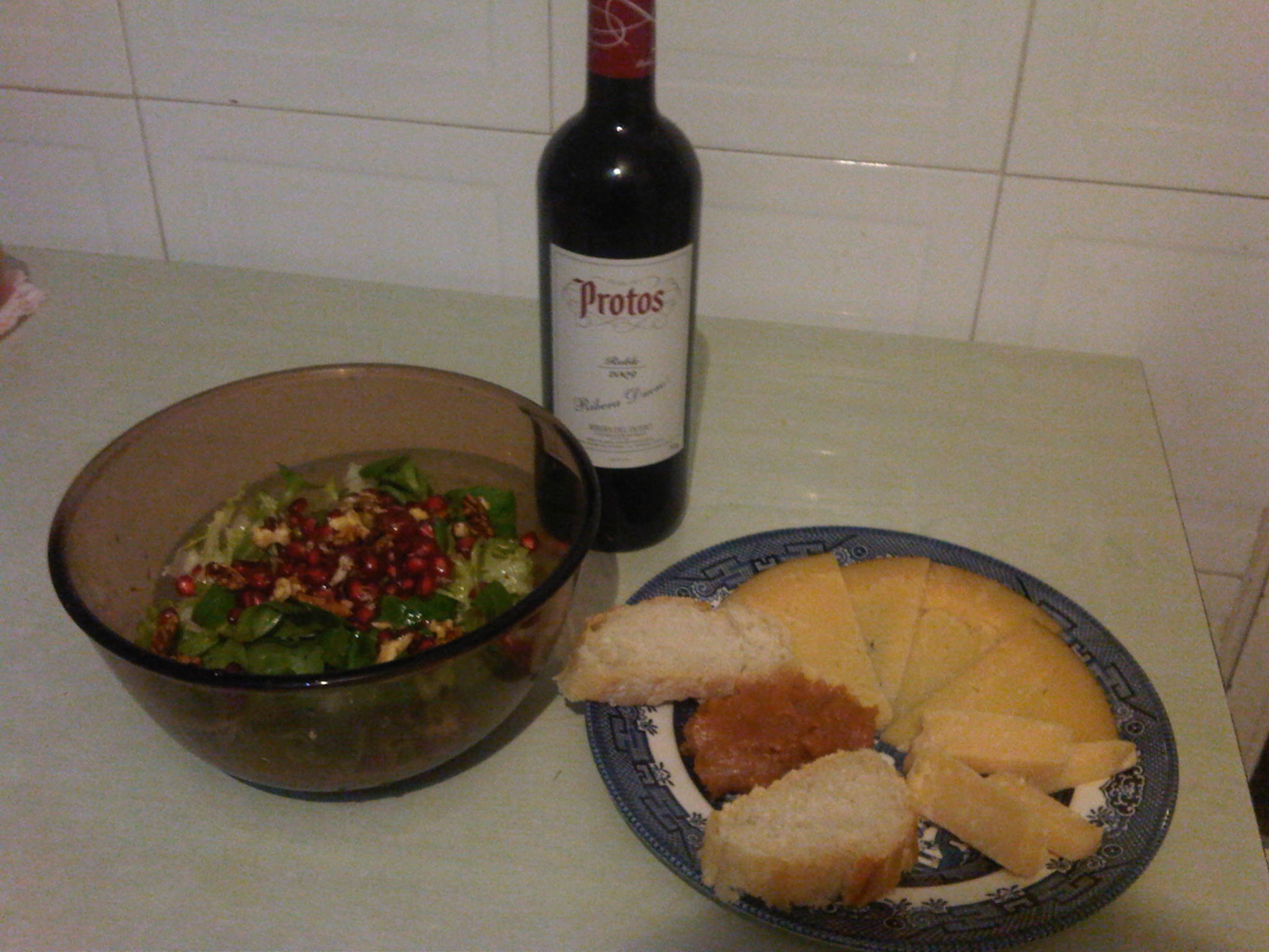 My homemade quince paste went perfectly with a sharp Manchego cheese and a bottle of Protos from Ribera del Duero. We added a light salad with pomegranate seeds and walnuts to round off this perfect snack.