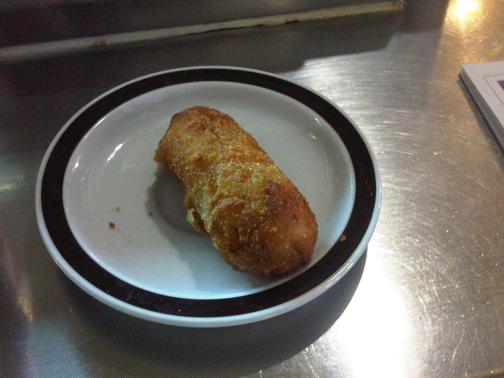 On a lighter note, I’ve enjoyed some great meals in Toledo with many wonderful friends. I’ve also enjoyed some quiet afternoons and nights alone with a tapa and glass of wine. This past June I went for a cold beer at a restaurant that I have frequented through the years because it is next door to the hotel where I often sleep. It is a bit of a dive and I usually only go in for a quick drink. Well, in June I was surprised with a tapa of one of the best Croquetas I have ever eaten. It was quite ugly as you can see, but the flavor was perfect.