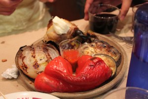 Since one needs to eat as well as enjoy art, my friends and I found a nice little “pinchos” bar in town.  “Pinchos” or “Pintxos” as written in Euskadi, the Basque language, are small snacks eaten in bars or taverns.  They are originally from the Basque country but also enjoyed in other areas of Northern Spain. They usually have a toothpick through the center attaching the snack to a piece of bread.  Pinchar means “to poke”.  You can choose your pintxos from various plates along the bar and at the end the bartender will count your toothpicks to tally your bill.  The honor policy is very important in Spain.  My friends and I enjoyed (too) many pintxos along with a few glasses of a smooth Ribera del Duero.  Being health conscious as we are, we also ordered a grilled vegetable plate which was served with a Romesco sauce.  Romesco sauce is typical in Catalunya and made from some  variation of dried red pepper, garlic, olive oil and hazelnuts. (photos by my dear friend Melissa)