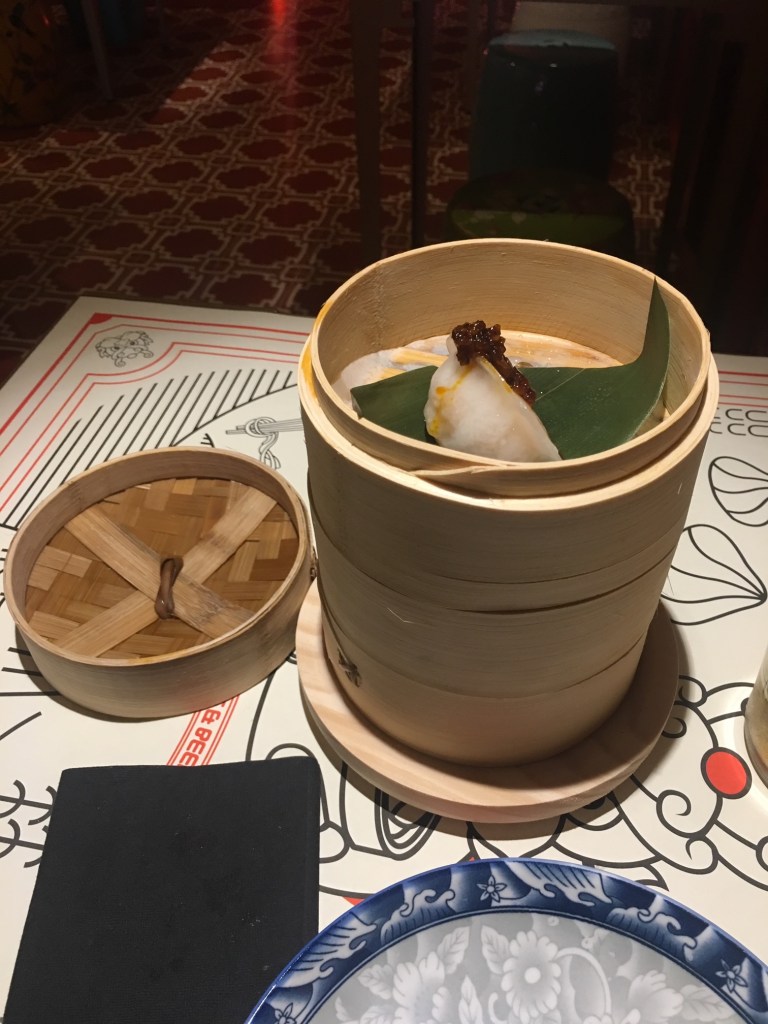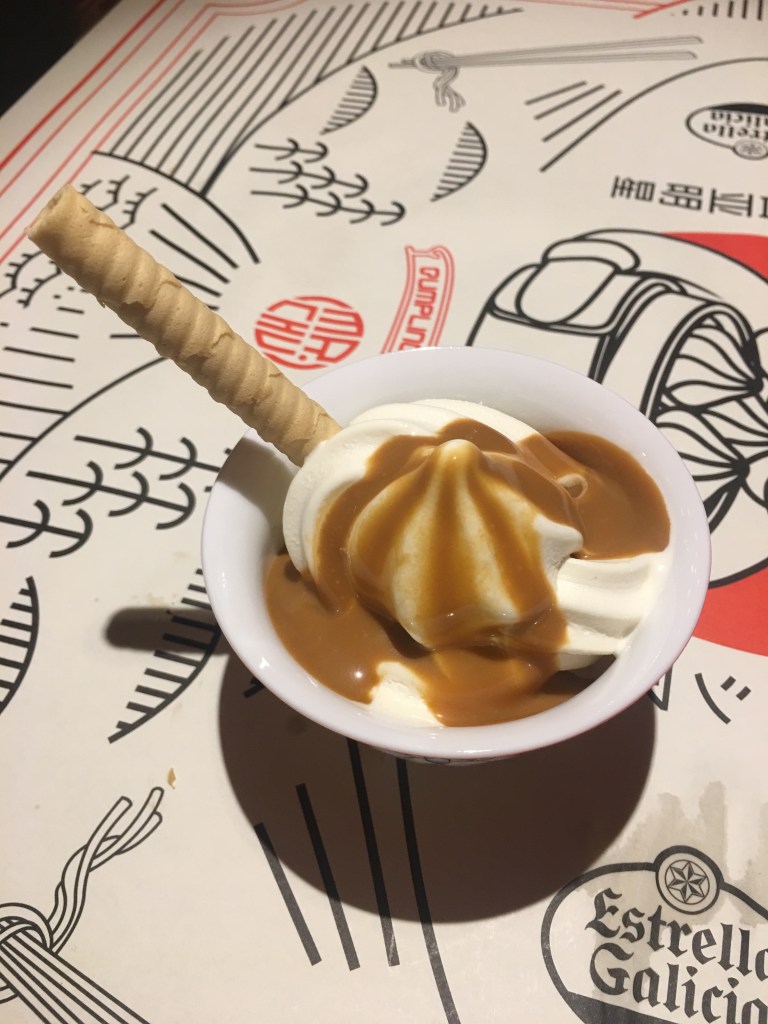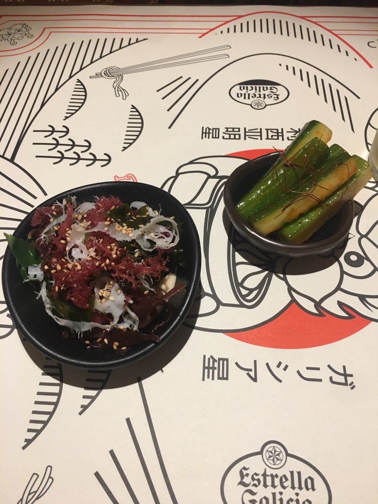 High class Chinese. 8 dishes and dessert. Each one better than the next. It was fun and different compared to the traditional food I enjoy so much of in Galicia. Seaweed and sesame salad, Cucumbers with Kimchi, White miso soup with Dimsum, Shrimp Har Gao with garlic and chilis, Hoisin Stew Bao, Chinese Dumplings with a brochette, Grilled Gyozas, Sichuan Wok and Vanilla and Salted Caramel Ice-Cream!