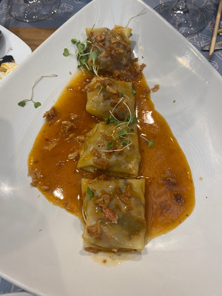 On my most recent trip to Cádiz we had an excellent lunch in a restaurant called La Marmita. The local wine was 80 percent Merlot with a small percentage of Petit Verdot and Syrah. I loved the name, Garum. Garum is the fermented fish condiment that was used in Phoenicia, Greece, Rome and beyond. With our wine we enjoyed the high quality red tuna prepared two ways, sashimi and tartar. Exquisite. We also had raviolis filled with pringá de Berza Gitana. This is a stew prepared with collard greens, onion, squash, tomato, peppers, chorizo, morcilla and beef shank. It is then chopped finely and used to fill the raviolis. I can’t wait to go back and repeat both dishes and more!