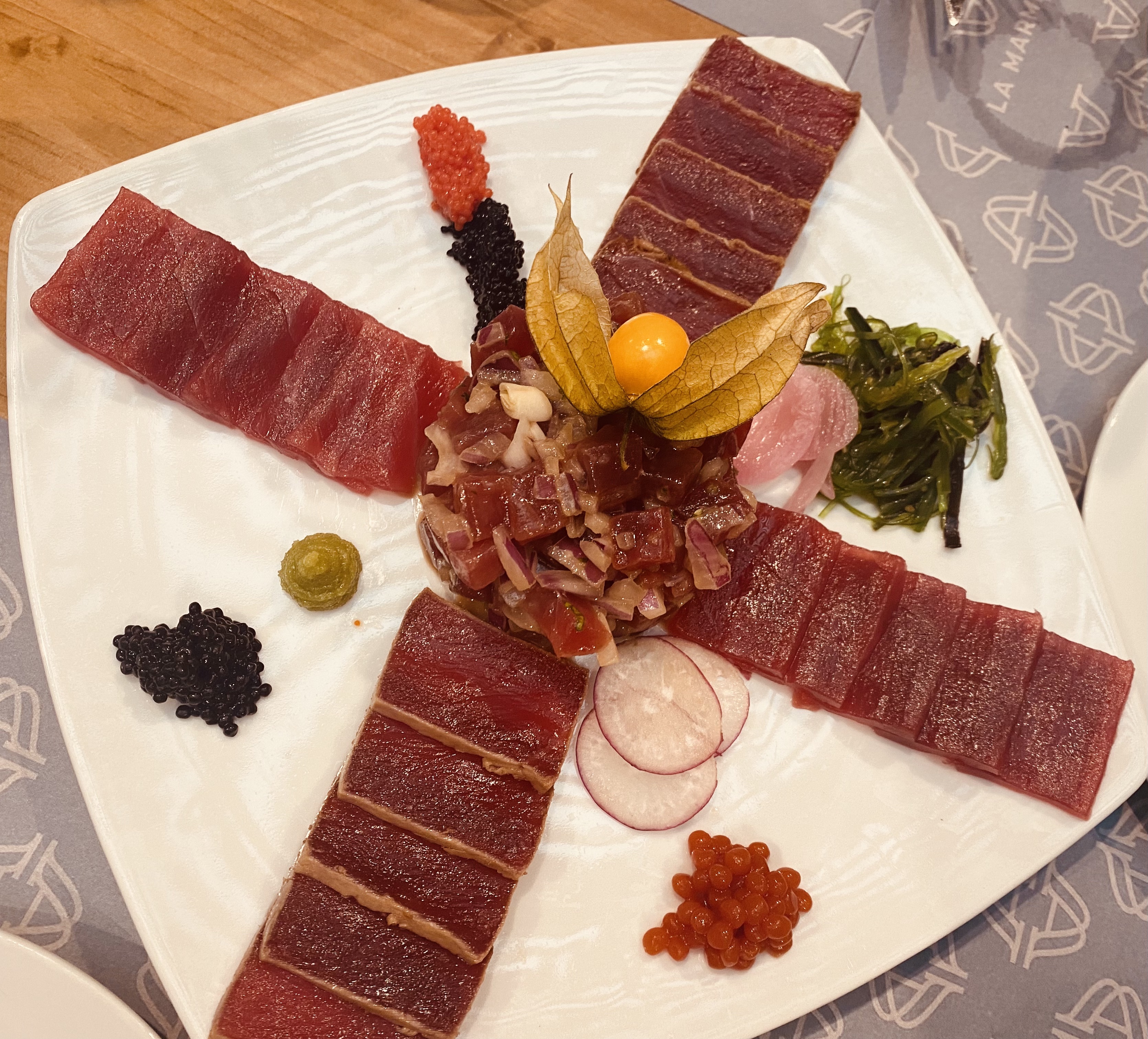 Another important gastronomical treasure in this area is the Atún de Almadraba. The word almadraba meaning to fight or strike comes from Arabic and refers to the fishing technique used to catch this highly prized red tuna. After the full moon in May and again in September and October fishing nets are strategically placed in the Atlantic waters close to the Straight of Gibraltar by fisherman from towns like Barbate, Zahara de los Atunes, Conil de la Frontera and Tarifa. The tuna are caught in the nets on their passage to or from the Mediterranean. The nets are lifted by the fishermen into a circle of boats surrounding the nets. In May the tuna have extra fat and are more succulent where as in the fall the tuna tends to be drier. The fall meat tends to be sent to the canneries. The tuna from the month of May is sold at high prices with about 80 percent being exported to Japan.