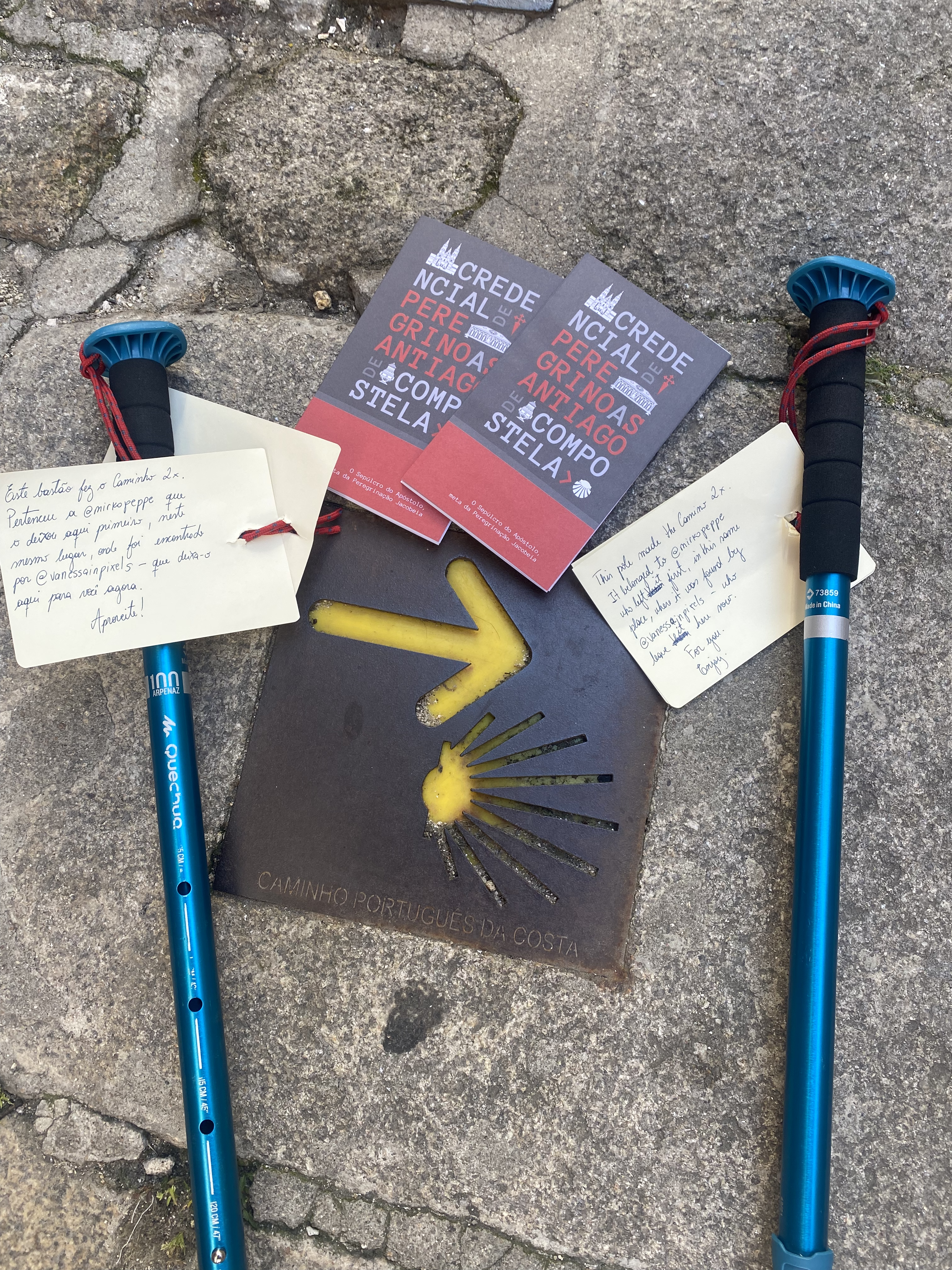 I always tell my groups about the miracles that happen along the Way, sharing with them my many stories to back this up. El Caminho Portuguesa Da Costa did not disappoint. We arrived in Porto on a wing and a prayer thanks to RyanAir and their constant strikes (miracle number 1). Our first stop was the Cathedral to pick up our pilgrim´’s passports. As we walked up to the main entrance I spotted two walking sticks propped against the facade of the Cathedral. Taking a closer look, I saw they each had a small note attached. Written in Portuguese and English each note said, “This pole made the Camino 2x. It belonged to …….. who left it first, in this same place, where it was found by …….. who leave it here now. For you. Enjoy”. There was no doubt in our minds and hearts that we had chosen the correct path.