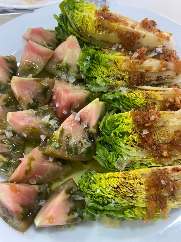 One of my favourites is the half tomato and half “cogollos” salad. Perfectly seasoned with olive oil and salt (more salt, more beer ordered) and the baby lettuce hearts are also topped with crispy fried garlic. Fantastic! It reminds me of the escarole and pomegranate salad I prepare every fall.